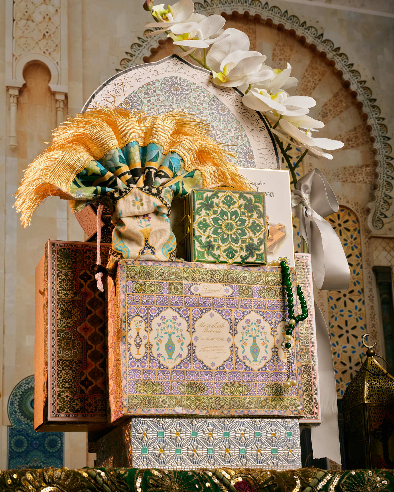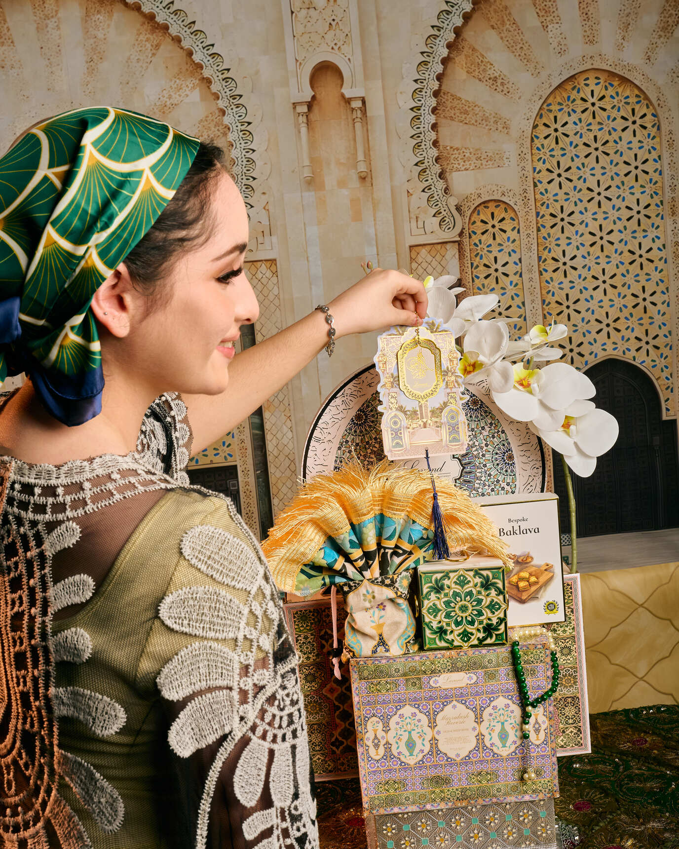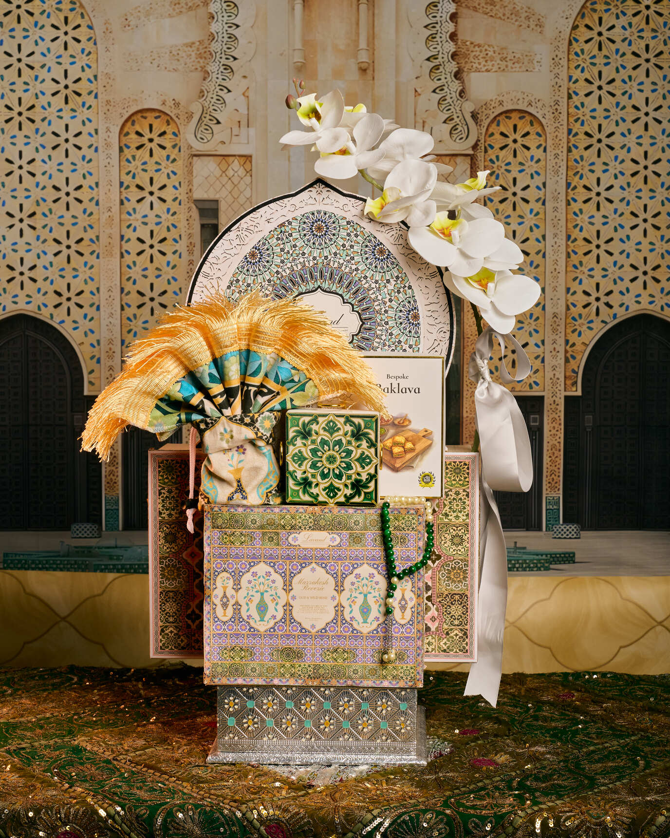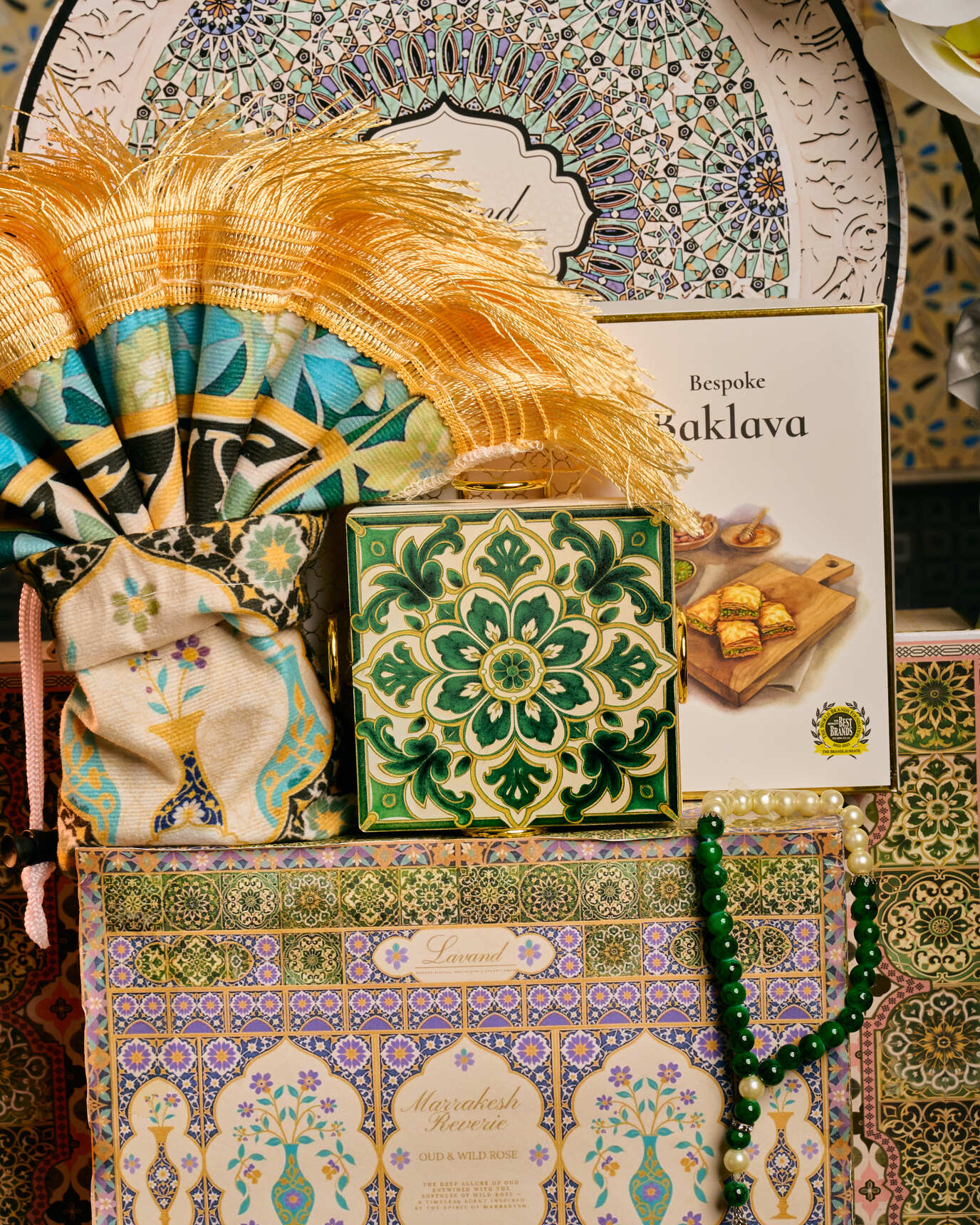 Assorted Lavand Baklavas Assorted Date Delights Nougat & Malban Moroccan Travel Sejadah Moroccan Coaster Set Oud & Wild Rose Home Fragrance Moroccan Tea Set (7pcs) Meenakari Metal Box Tasbih Gift Tag