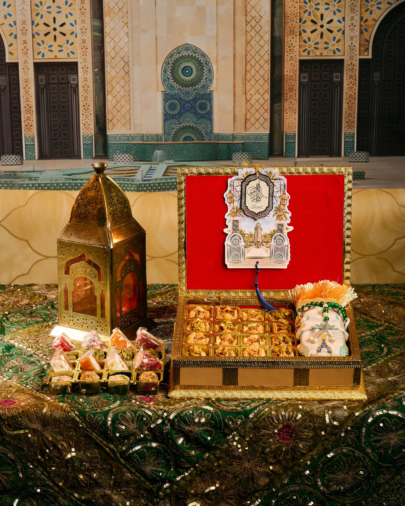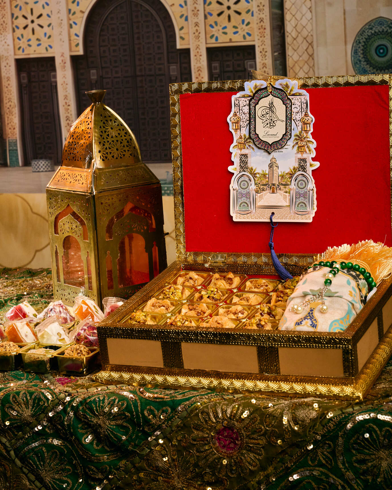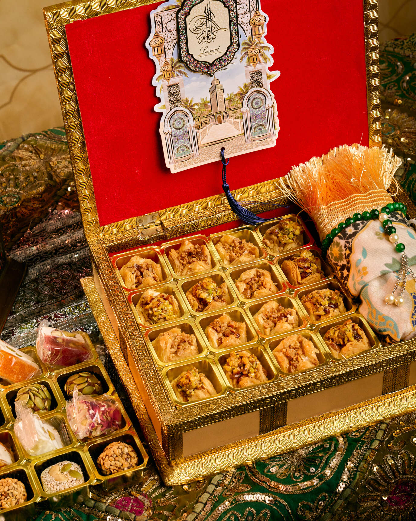 Handmade Metal Quran Box comes with a variety of Lavand Confectionery such as Baklavas, Date Delights, Nougat & Malban, Moroccan Travel Sejadah & Tasbih